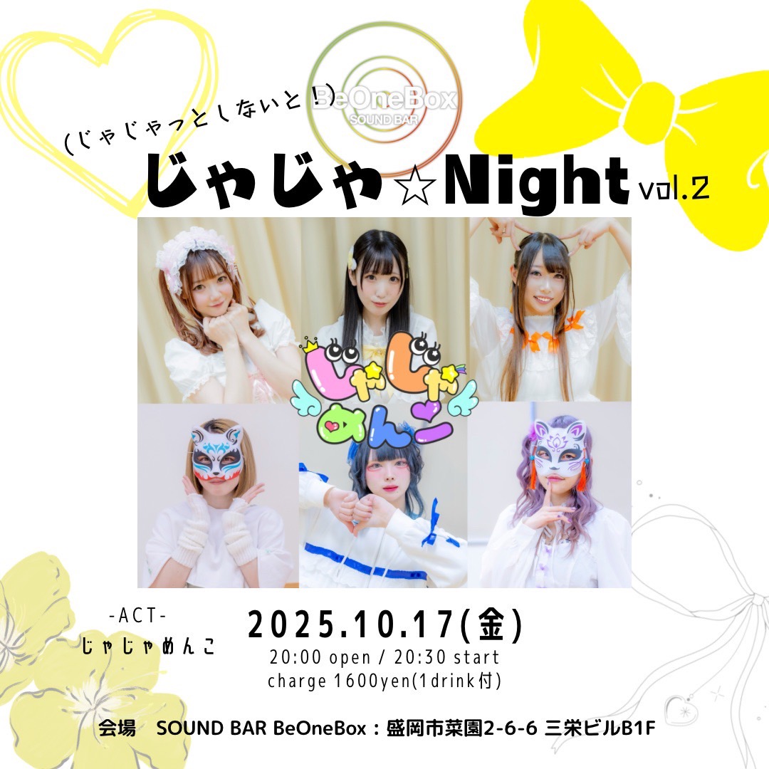 じゃじゃ☆Night vol.2 Posted on 2025.09.26 2025年10月17日(金) Open 20:00 / Start 20:30Charge 1,600yen(1drink付) act:じゃじゃめんこ