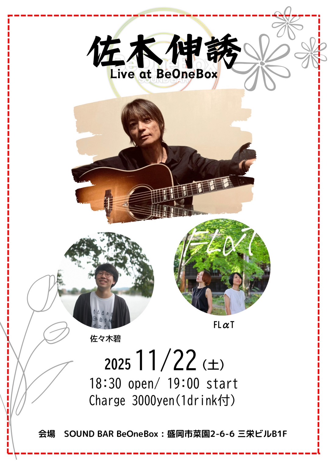 佐木伸誘 Live at BeOneBox Posted on 2025.09.26 2025年11月22日(土) Open 18:30 Start 19:00Charge 3,000yen(1drink付) act:佐木伸誘 / 佐々木碧 / FLαT