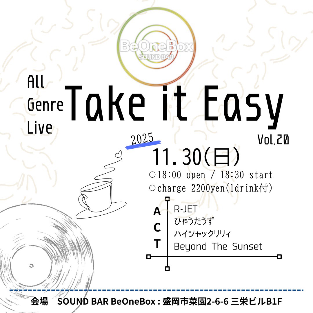 Take it Easy vol.20 Posted on 2025.10.06 2025年11月30日(日) Open 18:00 Start 18:30Charge 2,200yen(1drink付) cast:R-JET / ひゃうだうず / ハイジャックリリィ / Beyond The Sunset