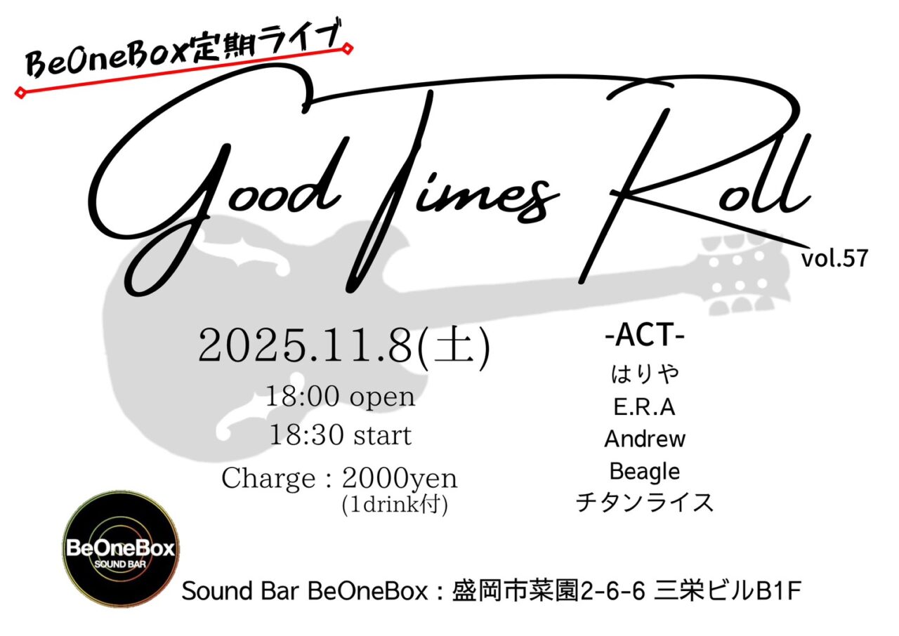 Good Times Roll vol.57 Posted on 2025.10.15 2025年11月8日(土) Open 18:00 Start 18:30Charge 2,000yen(1drink付) act:はりや / E.R.A / Andrew / Beagle / チタンライス