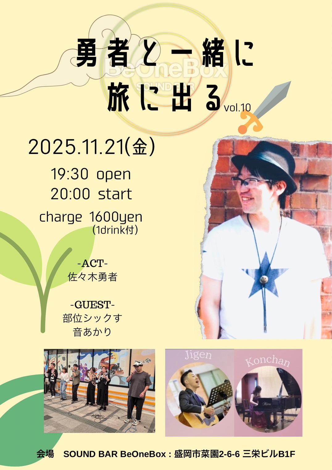 勇者と一緒に旅に出るvol.10 Posted on 2025.10.18 2025年11月21日(金) Open 19:30 Start 20:00Charge 1,600yen(1ドリンク付) act:佐々木勇者guest:部位シックす / 音あかり