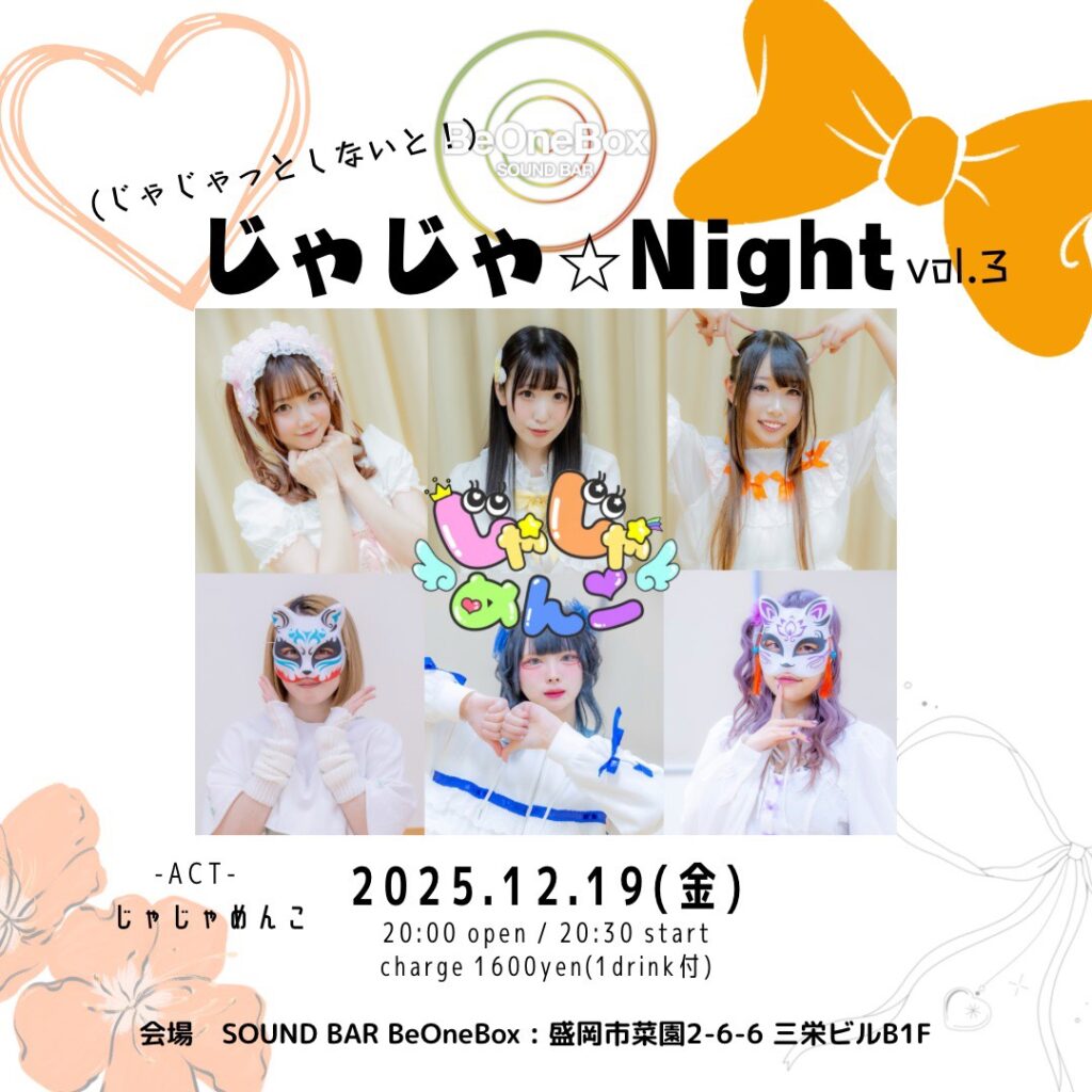 じゃじゃ☆Night vol.3 Posted on 2025.10.18 2025年12月19日(金) Open 20:00 / Start 20:30Charge 1,600yen(1drink付) act:じゃじゃめんこ