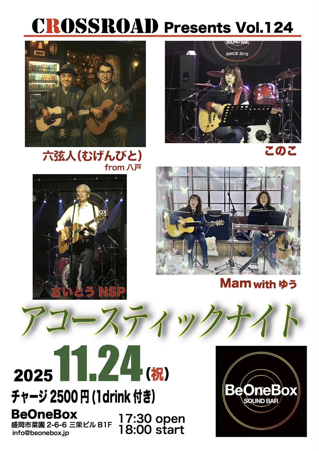 CROSSROAD Presents Vol.124 アコースティックナイト Posted on 2025.10.26 CROSSROAD Presents Vol.1242025年11月21日(祝)Open 17:30 Start 18:00 出演:六弦人 / このこ / さいとうNSP / Mam with ゆう チャージ 2,500円(1ドリンク付き)