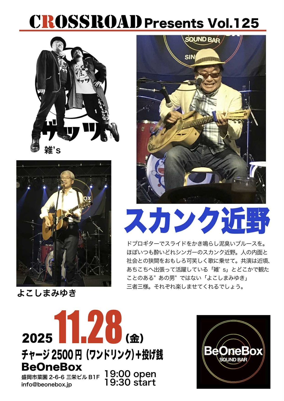 CROSSROAD Presents Vol.125 スカンク近野 Posted on 2025.10.26 CROSSROAD Presents Vol.1252025年11月28日(金)Open 17:30 Start 18:00 出演:スカンク近野 / 雑’s / よこしまみゆき チャージ 2,500円(1ドリンク)+投げ銭