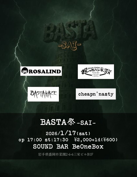 BASTA祭 -SAI- Posted on 2025.11.19 2026年1月17日(土) Open 17:00 Start 17:30Charge 2,000yen +1d(¥600) act:ROSALIND / おしゃれハンターXX / BASTAHAZE / cheapn’ nasty