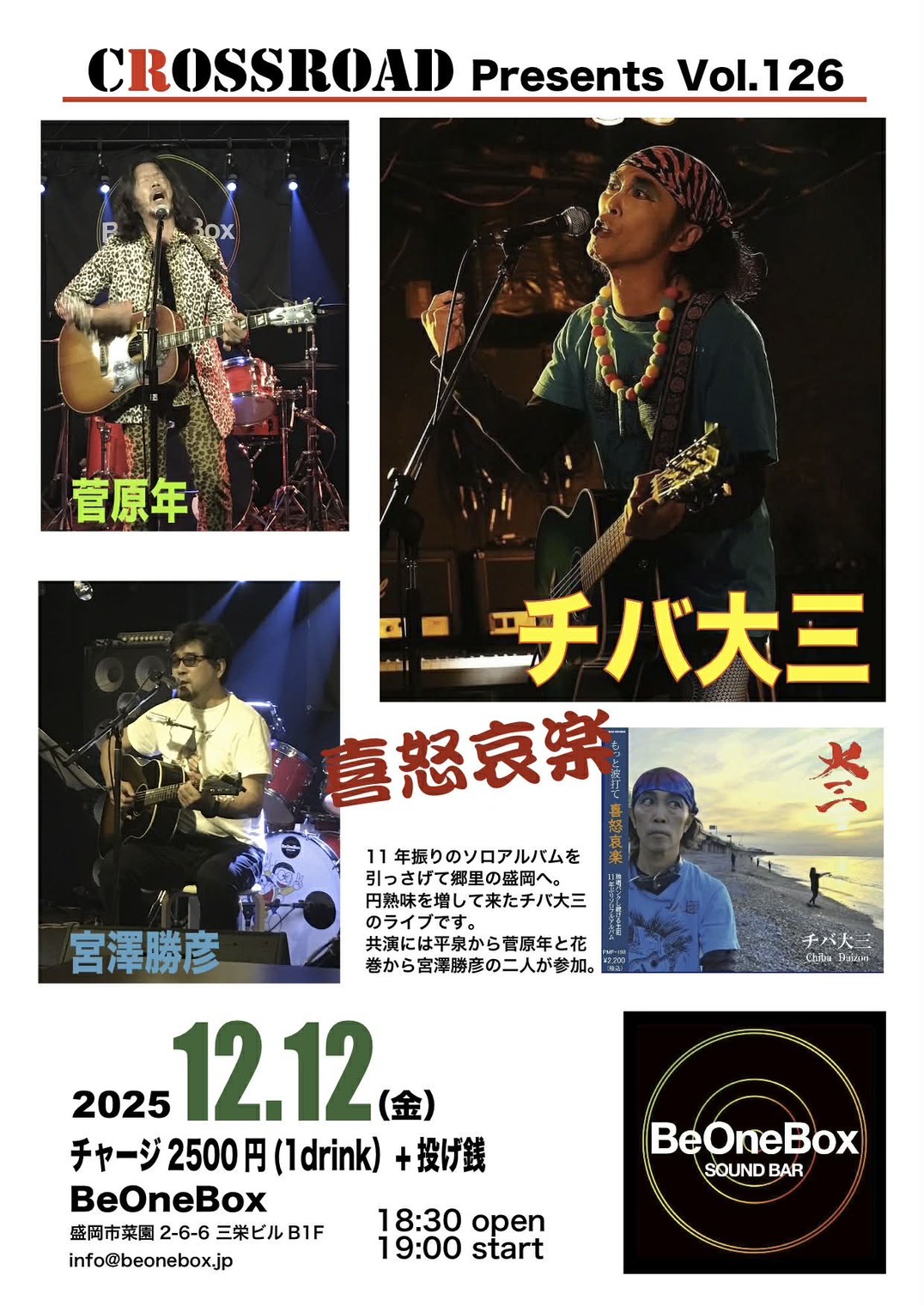 CROSSROAD Presents Vol.126 チバ大三 Posted on 2025.11.19 CROSSROAD Presents Vol.1262025年12月12日(金)Open 17:30 Start 18:00 出演:チバ大三 / 菅原年 / 宮澤勝彦 チャージ 2,500円(1ドリンク)+投げ銭