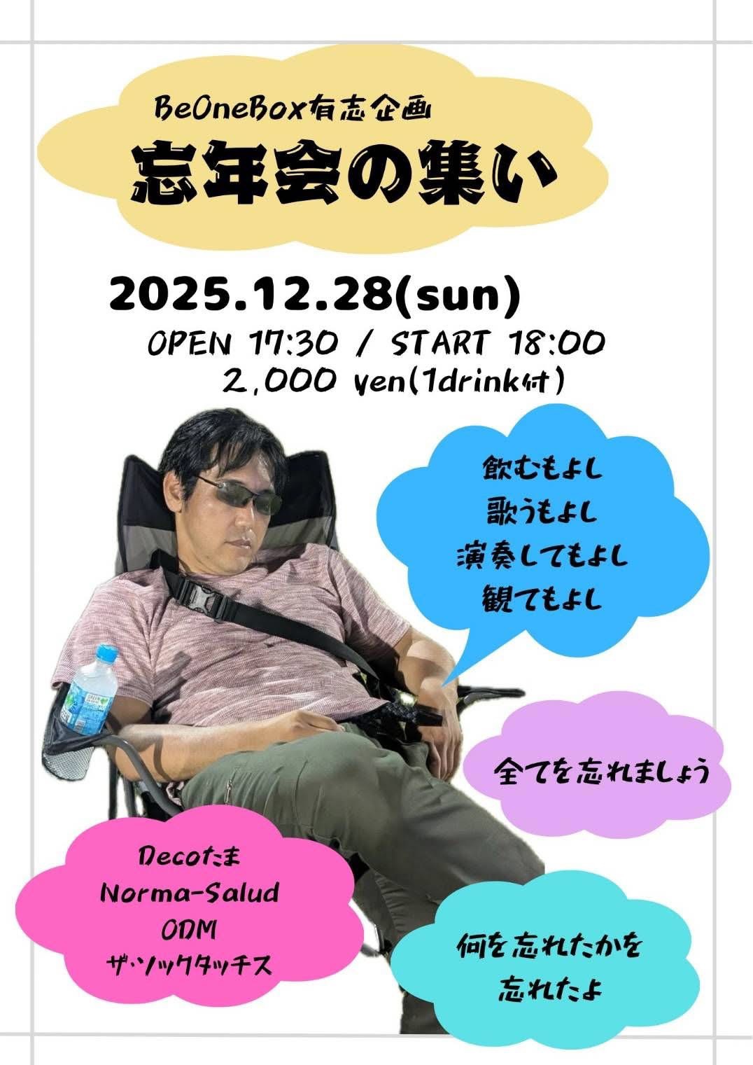 BeOneBox有志企画 忘年会の集い Posted on 2025.12.21 2025年12月28日(日) Open 17:30 Start 18:30Charge 2,000yen(1drink付) act:Decoたま / Norma-Salud / ODM / ザ・ソックタッチズ