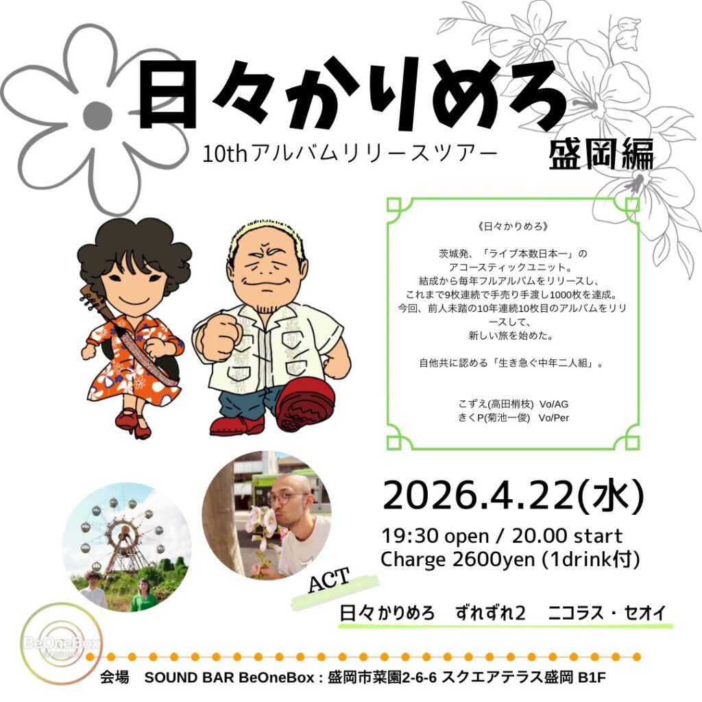 日々かりめろ 10thアルバムリリースツアー盛岡編 Posted on 2026.02.21 2026年4月22日(水) Open 19:30 Start 20:00Charge ¥2,600 (1drink付) act:日々かりめろ / ずれずれ2 / ニコラス・セオイ