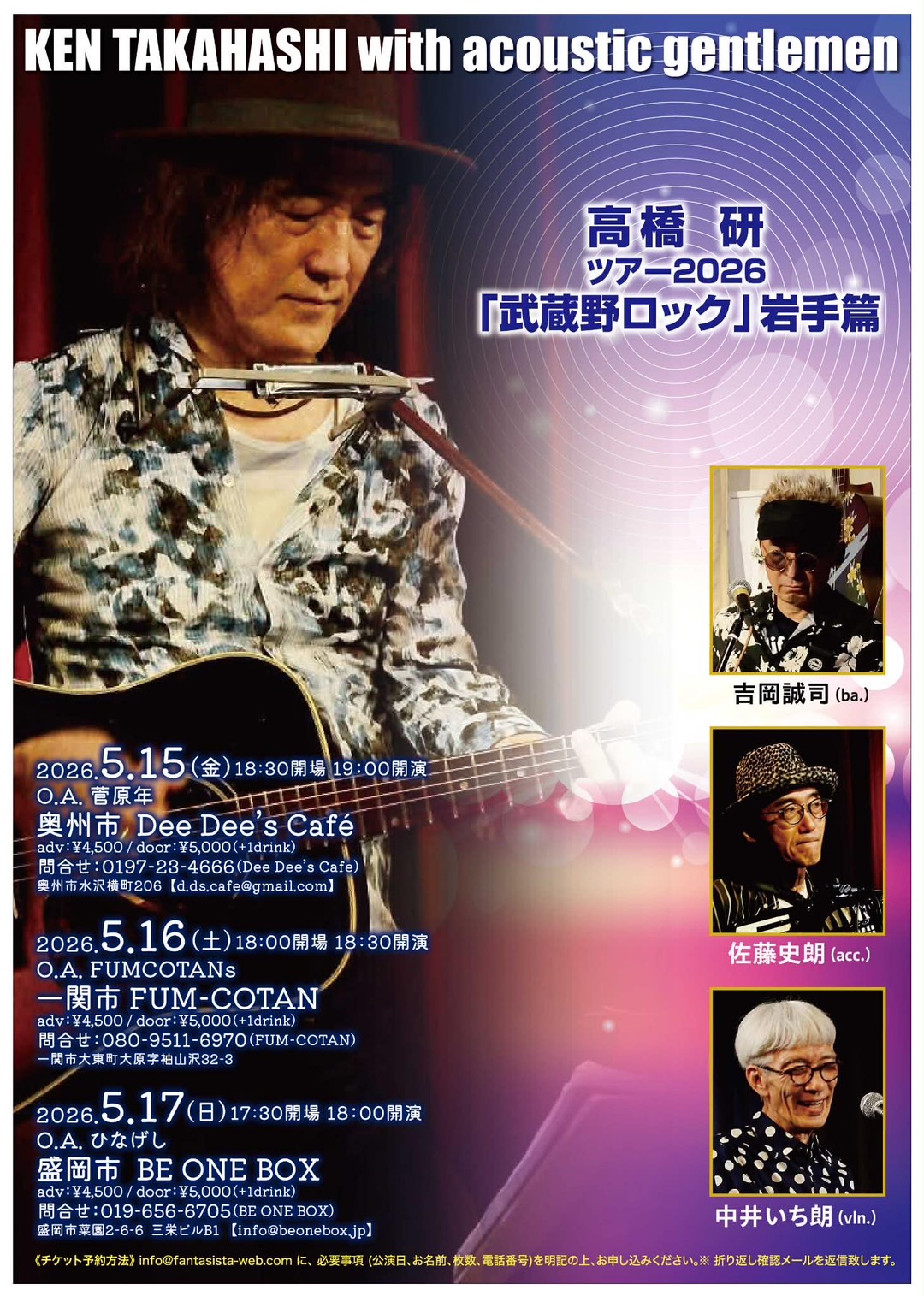 高橋研ツアー2026「武蔵野ロック」岩手篇 Posted on 2026.02.26 2026年5月17日(日) Open 17:30 Start 18:00Charge ADV ¥4,500 / DOOR ¥5,000(+1drink) O.A.:ひなげし