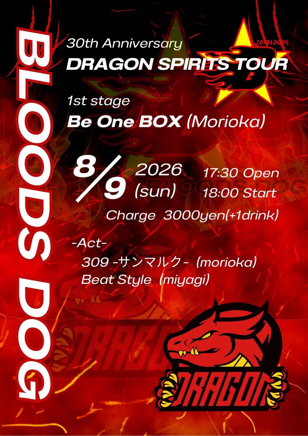 30th Anniversary DRAGON SPIRITS TOUR Posted on 2026.03.04 2026年8月9日(日) Open 17:30 / Start 18:00Charge 3,000yen (+1drink) ACT: BLOODS DOG / 309 -サンマルク- / Beat Style