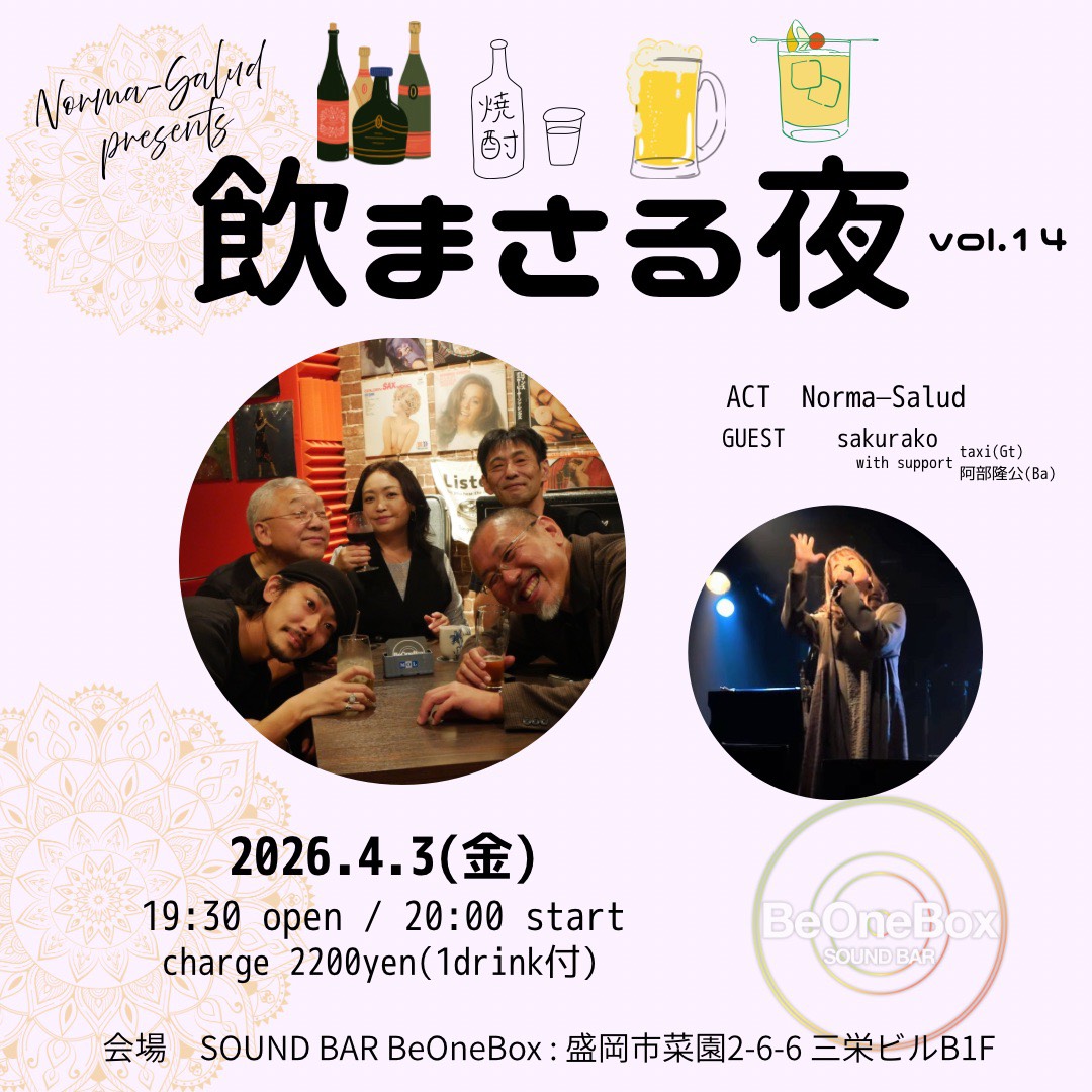 飲まさる夜 vol.14 Posted on 2026.03.14 2026年4月3日(金) Open 19:30 / 20:00 StartCharge 2,200yen(1drink付) act:Norma-Saludguest:sakurako