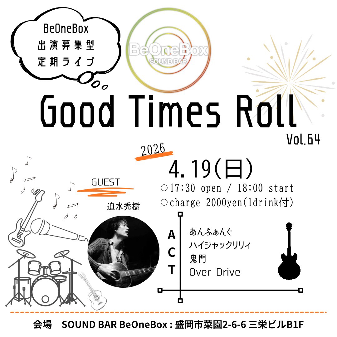 Good Times Roll vol.64 Posted on 2026.03.14 2026年4月19日(日) Open 17:30 Start 18:00Charge 2,000yen(1drink付) guest:迫水秀樹act:あんふぁんぐ / ハイジャックリリィ / 鬼門 / Over Drive